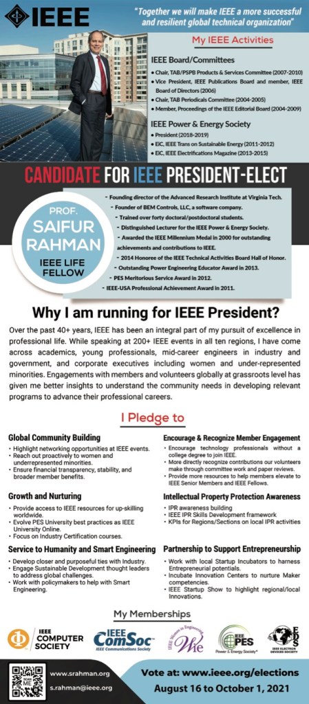 It is our privilege to share with you that Professor Saifur Rahman at Virginia Tech is running for 2022 IEEE President-Elect. The 2022 President-Elect will become President in 2023.