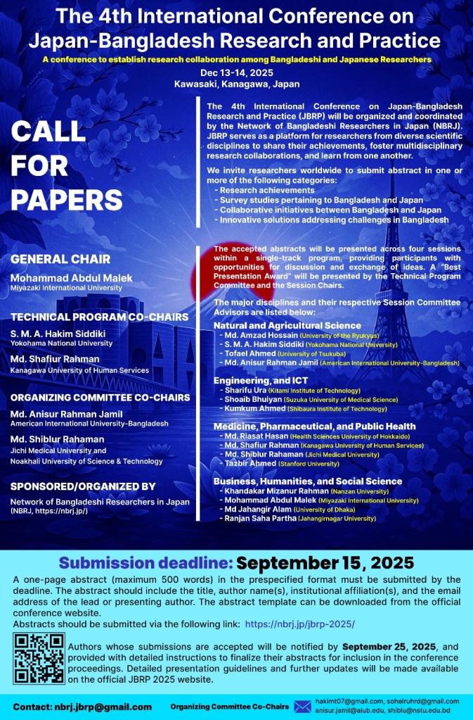 Join us for the 4th International Conference on Japan−Bangladesh Research and Practice (JBRP2025), to be held on December 13-14, 2025, in Kawasaki City. Organized by the Network of Bangladeshi Researchers in Japan (NBRJ), this conference offers a dynamic platform for researchers to present their work, fostering interdisciplinary collaboration and intellectual exchange.